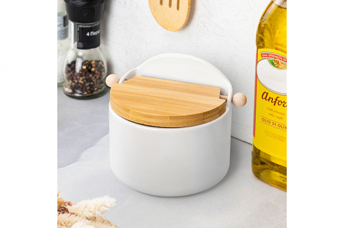 БЫЛО 633 руб! Банка для сыпучих продуктов 500 мл 15*10*11,1 см "Белая" + откидная бамбук.крышка, керамика