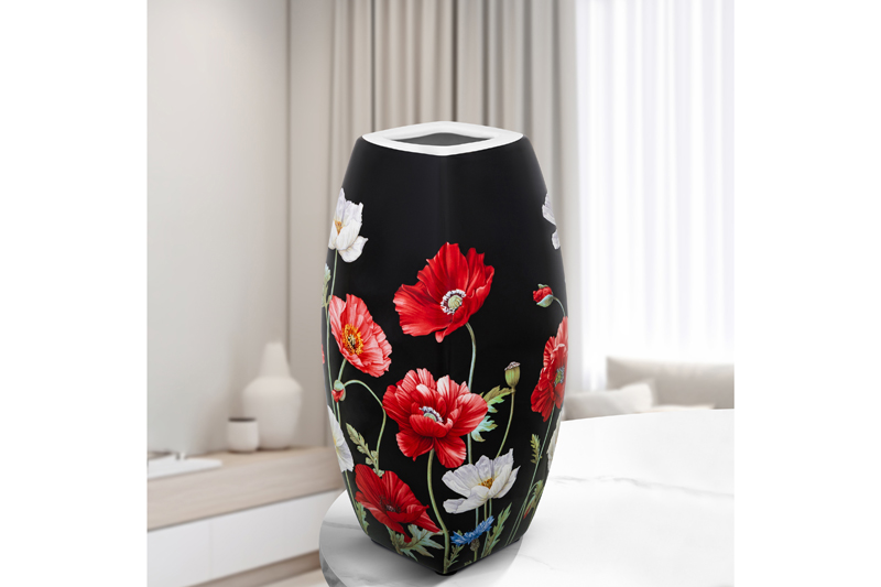 БЫЛО 1478руб!!* Ваза 1,5 л 11*11*21 см "Маки на черном" квадрат, NEW BONE CHINA