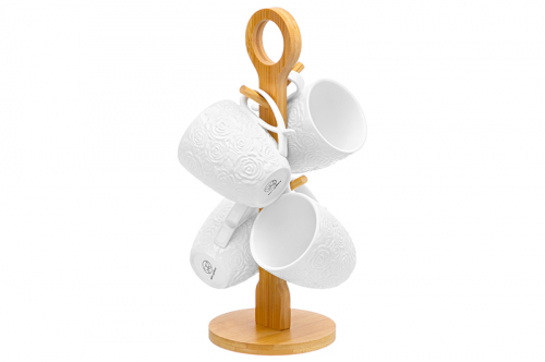 БЫЛО 1627 руб! Набор 4 кружек 300 мл 19*19*34 см "Розы" на дерев. подставке с ручкой 13*13*34 см