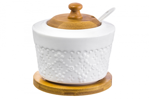 БЫЛО 444 руб! Сахарница 620 мл 11*11*12 см "Белое кружево" + ложка + дер. крышка на дер. подставке