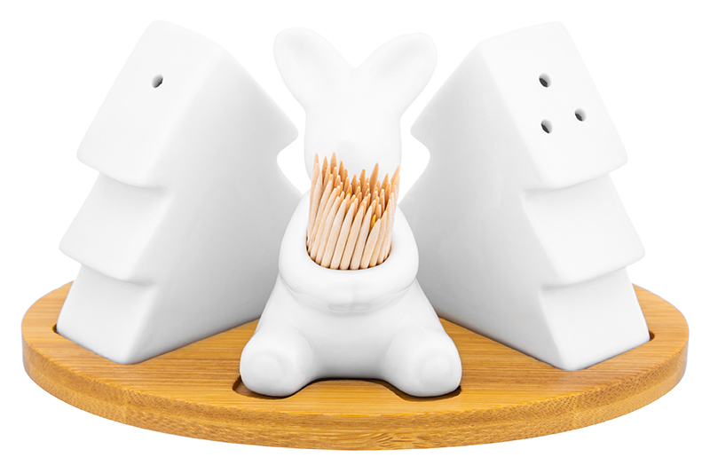 БЫЛО 553 руб. Вазочка под зубочистки + набор для специй 3 пр. 15,5*9,5*8,5 см 45 мл "Зайка в елочках" на дер.подст