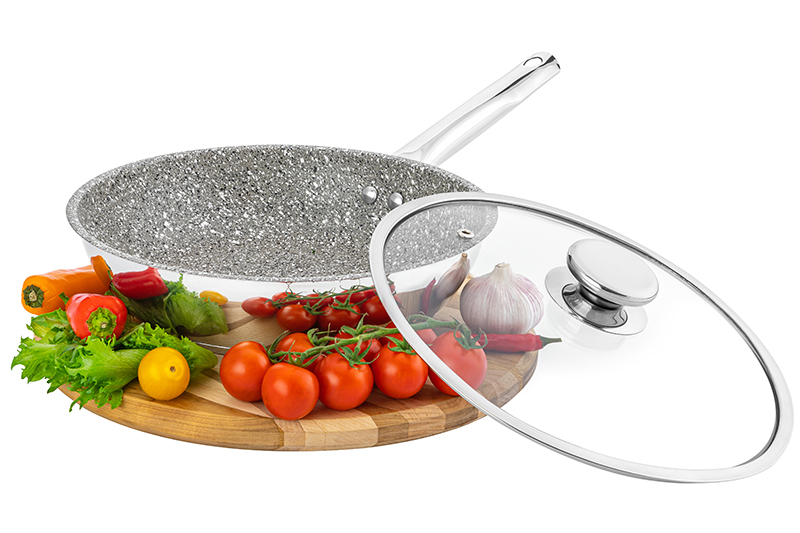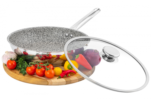 БЫЛО 3561 руб! Сковорода глубокая 28 см ГАРМОНИЯ ВКУСА "Серебро" серый мрамор С КРЫШКОЙ ф28, н/р, 49*29,9*10,5 см