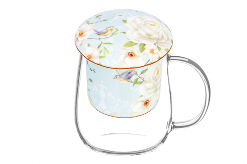 БЫЛО 418 руб!!! "Кружка стекло фарфор/сито 400 мл 11,3*8,5*12 см "Дикая роза" + крышка, NEW BONE CHINA"