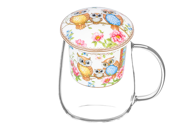 БЫЛО 418 руб!!! "Кружка стекло фарфор/сито 400 мл 11,3*8,5*12 см "Совушки" + крышка, NEW BONE CHINA"