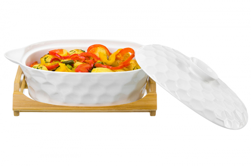 БЫЛО 1351 руб!!! "Блюдо д/зап и серв 29,5*17*12 см 1,3 л "Соты" + крышка на дер. подставке"