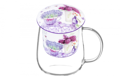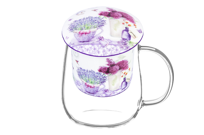 БЫЛО 418 руб!!! "Кружка стекло фарфор/сито 400 мл 11,3*8,5*12 см "Лаванда" + крышка, NEW BONE CHINA"