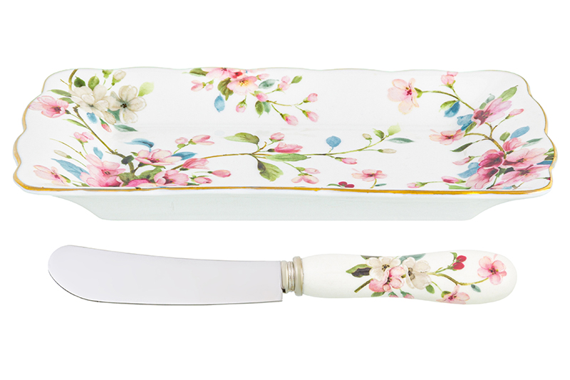 Тар. п/масло 17*10*2 см "Яблоневый цвет на белом" + нож NEW BONE CHINA