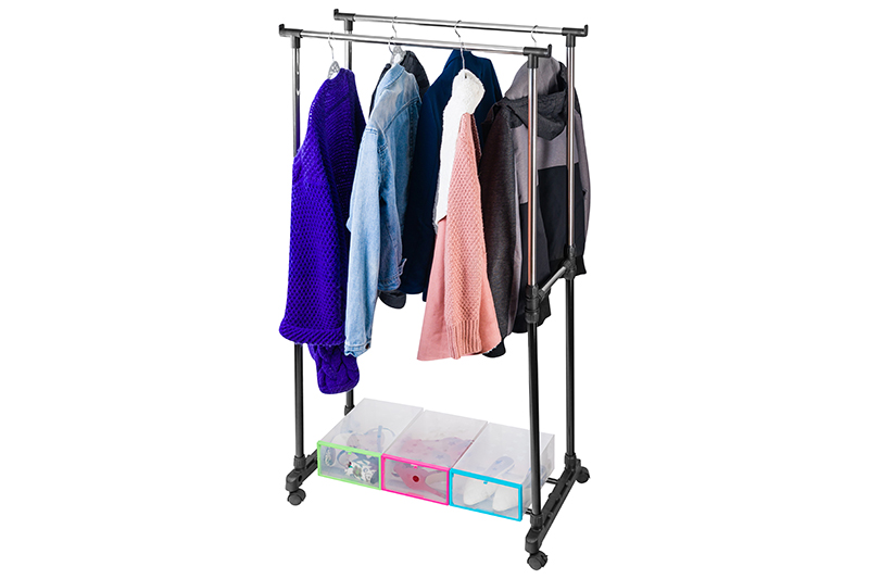 Вешалка для одежды телескопическая 2 перекладины 80*42*93-155 см "Серебристо-черная" на колесиках