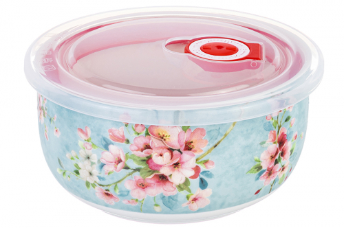 Салатник 13*13*6,5 см 560 мл "Яблоневый цвет на голубом" с пласт.крыш. с силик.уплот.,без зол.каемки