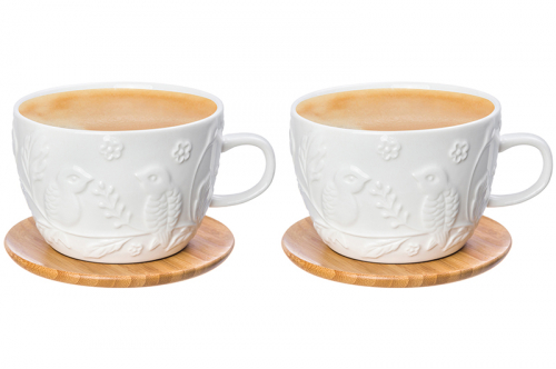 Чашка для капучино и кофе латте 500 мл 14*11,2*8 см "Птички на ветке" + дерев. подставка (2 шт.)
