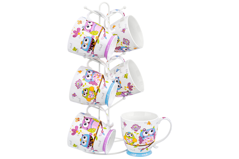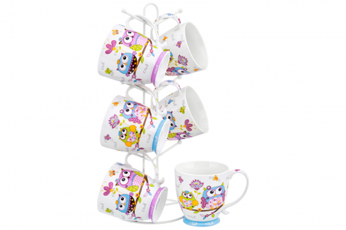 Набор 6 кружек 450 мл "Совы на ветке" голубая + сиреневая, на металлической подставке 15*15*41,5 см