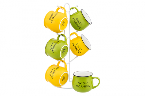 Набор 6 кружек 400 мл "GOOD MORNING" ярко-желтые + ярко-салатовые, бочонок на мет.под