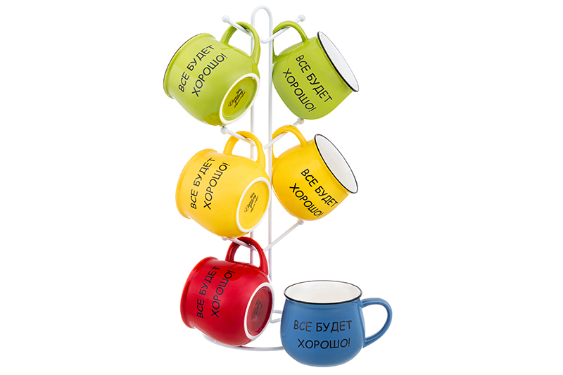 Набор 6 кружек 400 мл "Все будет хорошо!" индиго,красная,ярко-жел,ярко-сал.бочон.на мет.под