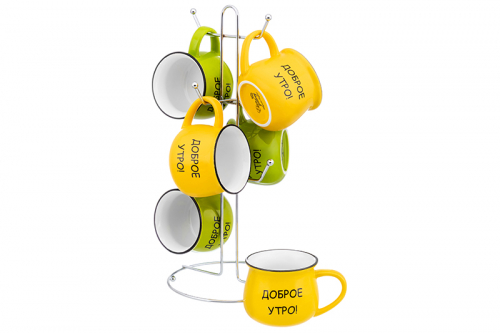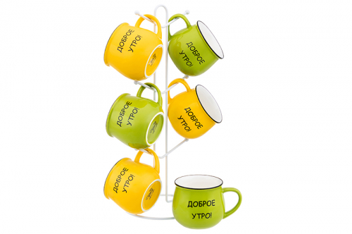 Набор 6 кружек 250 мл "Доброе утро!" ярко-желтые + ярко-салатовые, бочонок на мет.под