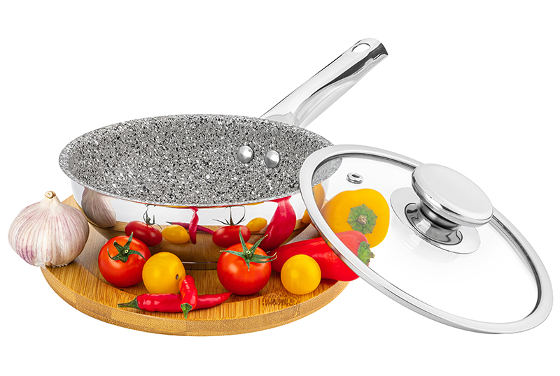 Без акции 2801 руб! Сковорода глубокая 16 см ГАРМОНИЯ ВКУСА "Серебро" черный мрамор С КРЫШКОЙ ф16, н/р, 33,5*17,5*9,2 см
