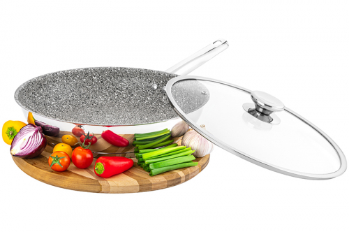 Без акции 4506 руб! Сковорода глубокая 28 см ГАРМОНИЯ ВКУСА "Серебро" серый мрамор С КРЫШКОЙ ф28, н/р, 49*29,9*10,5 см