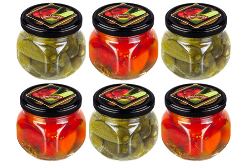 Набор 6 банок 350 мл 8,5*8,5*8,5 см с крышками "Огурцы и помидоры" ТО-82 мм 8,2*8,2*0,8 см