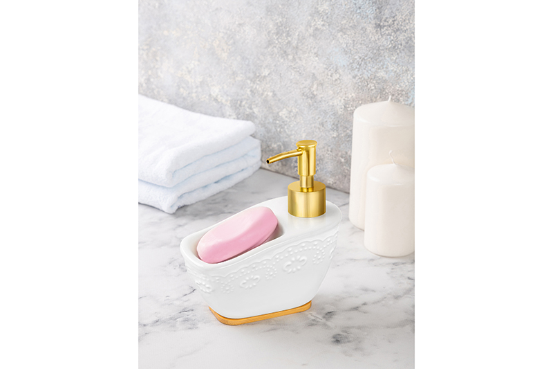 БЫЛО 869 руб! Диспенсер 15,5*8,5*15,5 см 500 мл "Белый узор" + губка на дер. подст.