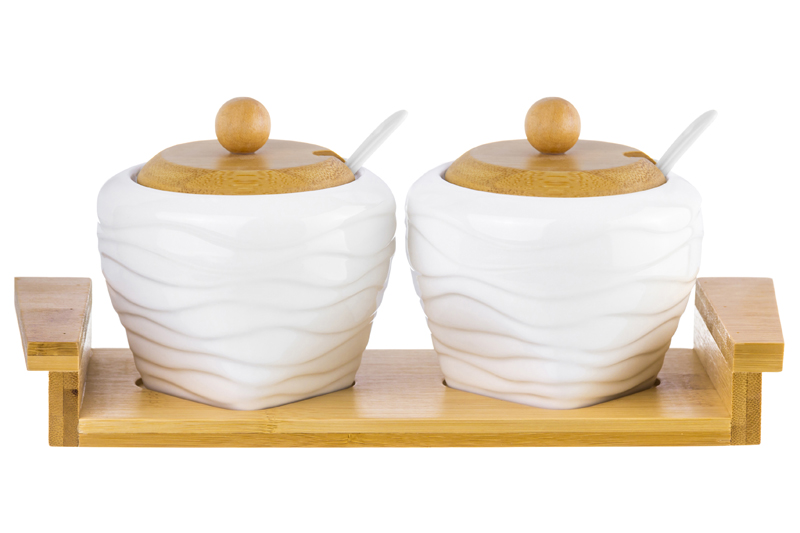БЫЛО 980 руб!! Набор 2 сахарниц 400 мл 24,5*10*11 см "Айсберг волны" + ложки + дер. крышки на дер. подставке