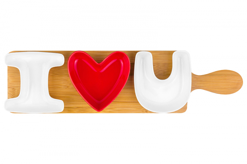 БЫЛО 1010 руб! Набор 3 сервировочных блюд 42*11*4 см "I love you - СЕРДЦЕ КРАСНОЕ" на деревянной подставке