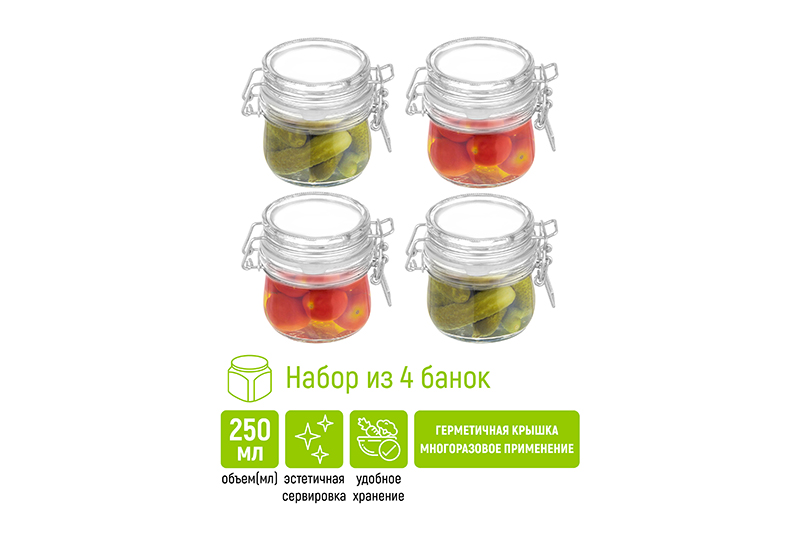 Набор 4 банок д/хранения 250 мл 11*8*8,7 см с крышкой с силикон.уплотнит. и металл зажимом