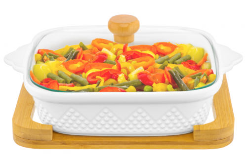 БЫЛО 1273 руб! Блюдо д/зап и серв 30*18*13 см 1,1 л "Ромбики" прямоуг. + стекл крышка, на дер подставке