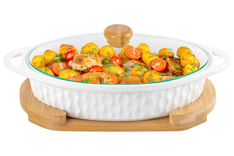 Блюдо д/зап и серв 29*17*12 см 900 мл "Айсберг" овал + стекл. крышка на дер. подставке