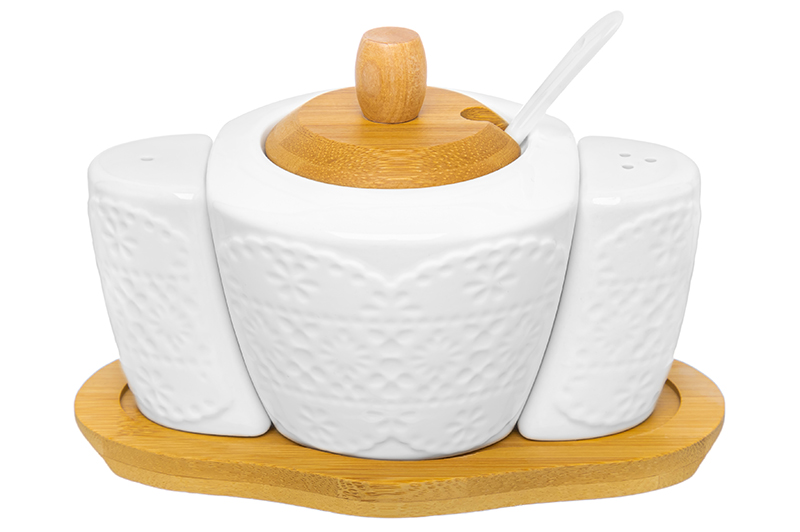 БЫЛО 747 руб! Набор - сахарница 300 мл 16*10*11 см "Кружево" с ложкой + солонка + перечница на дер. подставке