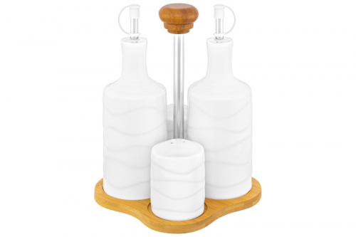 БЫЛО 1186 руб! Набор для специй и масла/уксуса/соев.соуса 4 пр. 18*18*22 см "Айсберг волны" на дер. подст. с ручкой