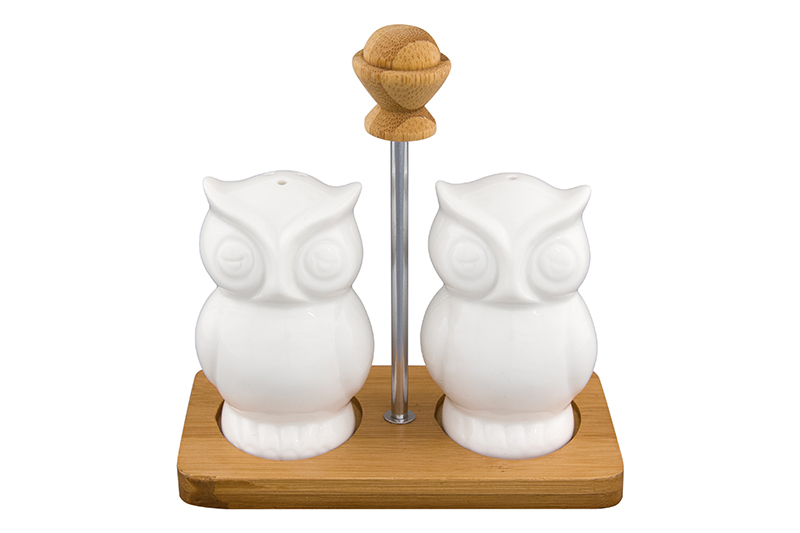 БЫЛО 408 руб! Набор д/специй 2 пр. 12*7*12,5 см "Совы" на дерев. подставке с ручкой