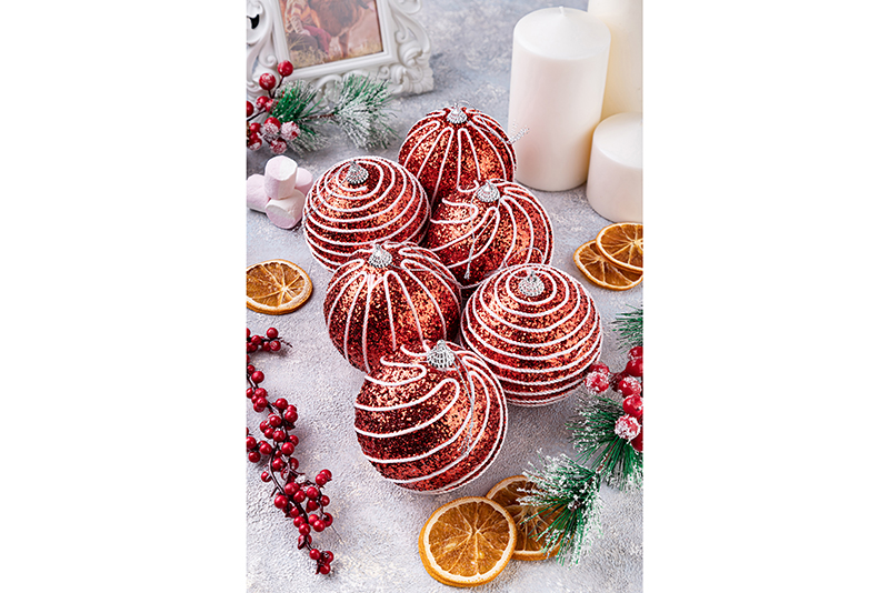 Набор 6 новогодних шаров 9,5*9,5 см "Полоски" красный
