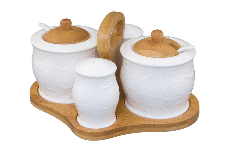 БЫЛО 1774 руб! Набор д/специй и 2 банки д/хранения 22*18*12 см "Белые розы" на дер. подставке с ручкой + 2 ложки