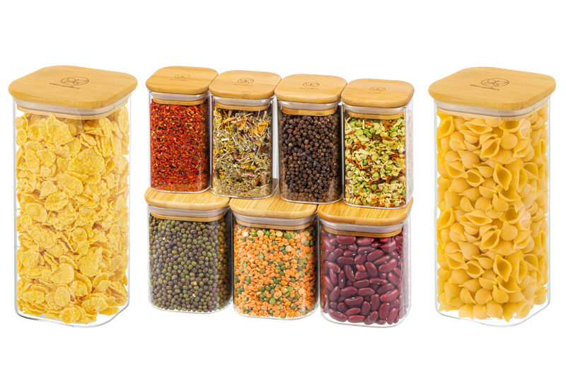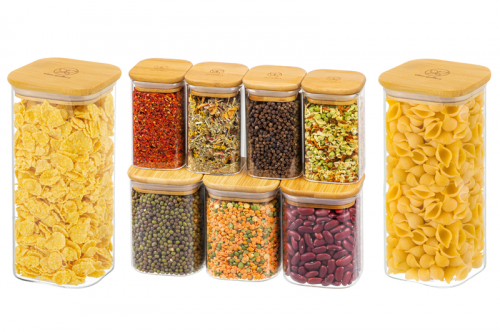 БЫЛО 2813 руб! Набор 9 банок д/хранения 3 пр. 450 мл+4 пр. 250 мл+2 пр. 1,6 л "Crystal glass"+ бамб.крыш. с сил.упл