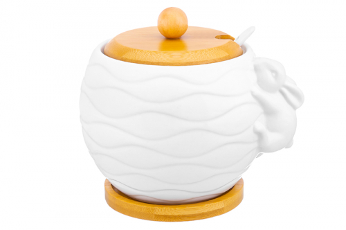 БЫЛО 680 руб! Сахарница 620 мл 12*12*12 см "Кролик" волны + ложка + дер. крышка на дер. подставке