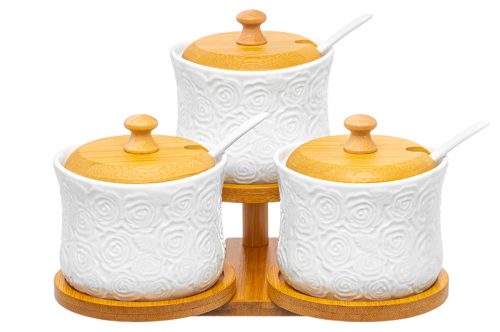 Набор 3 банок д/хранения 250 мл 20,5*17,5*14,5 см "Розы" на дер. подставке + 3 ложки