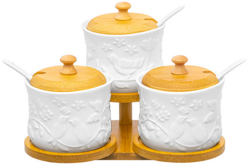 Набор 3 банок д/хранения 400 мл 21*19*17 см "Птички на ветке" на дер. подставке + ложки
