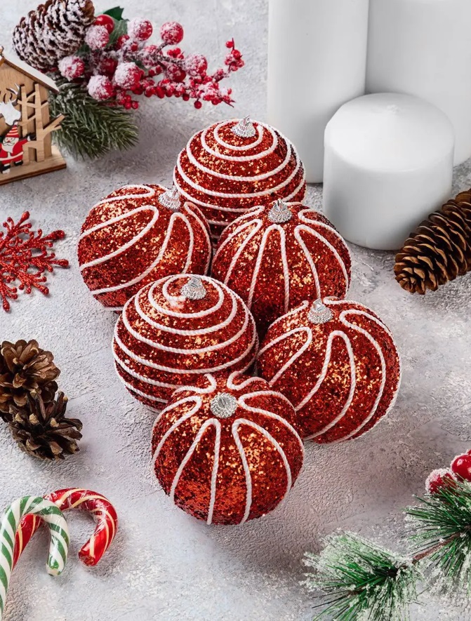 БЫЛО 1007р! Набор 6 новогодних шаров 9,5*9,5 см "Полоски" красный