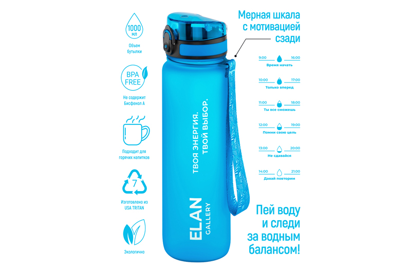БЫЛО 1090 руб! Бутылка для воды 1000 мл 7,8*7,8*28,5 см "Style Matte" мотивационная аквамарин-морская волна