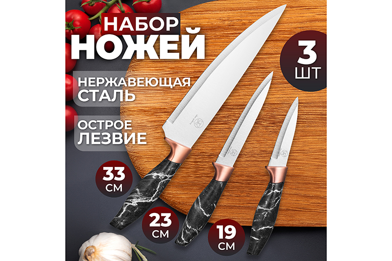 БЫЛО 764 руб! Набор 3 ножей 19,5*2*2,8 см + 23,5*2*2,8 см + 33*2,5*4,6 см "Мрамор" с черной ручкой