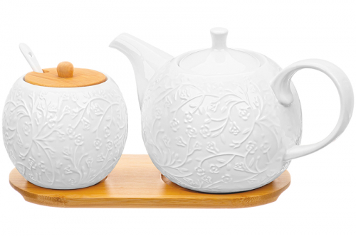БЫЛО 1209 руб! Набор - чайник 900 мл + сахарница 450 мл "Веточки-цветочки" с ложкой на дер. подставке