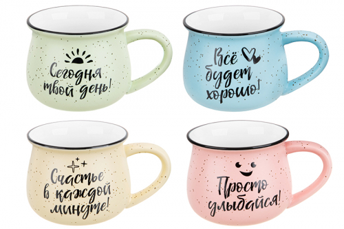 БЫЛО 1236 руб! Набор 4 кружек 250 мл 11*8*7 см "Мотивационные" голубая, пудровая, желтая, мятная, форма бочонок