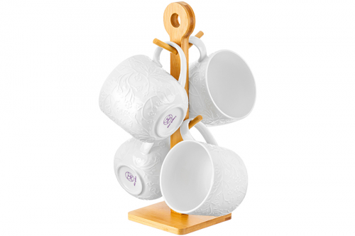 БЫЛО 1480 руб! Набор 4 кружек 350 мл "Кружево" на дерев. подставке с ручкой