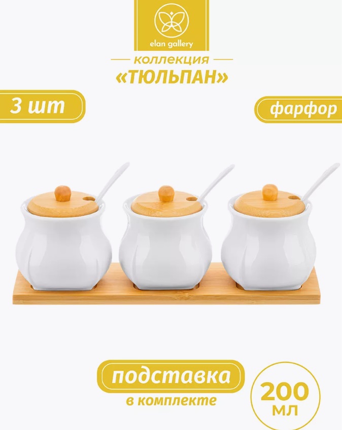 БЫЛО 1113р! Набор 3 банок д/специй 200 мл "Тюльпан" + 3 ложки + 3 крышки на дер. подставке