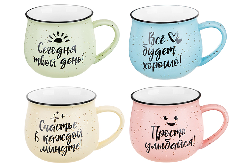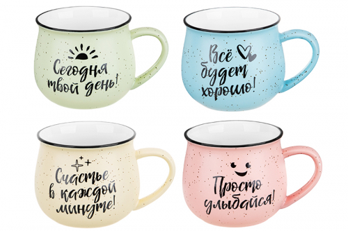 Набор 4 кружек 400 мл 13*9,5*8 см "Мотивационные" голубая, пудровая, желтая, мятная, форма бочонок
