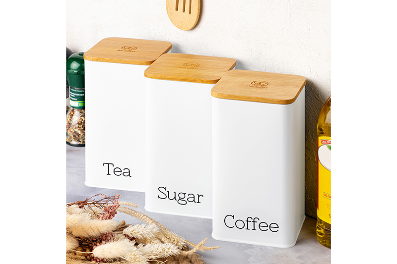 БЫЛО 1676 руб! Набор 3 банок для сыпучих продуктов 1,6 л 9,5*9,5*18,5 см "Tea, coffee, sugar" белый с бамбук.крышк