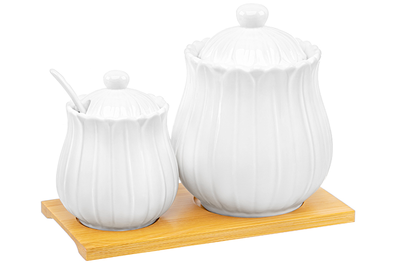 БЫЛО 863 руб! Набор 2 банок д/хранения 320 мл 19,5*10*9,5 см "Веточки-цветочки" + 2 ложки + дер.крышк.на дер.подст