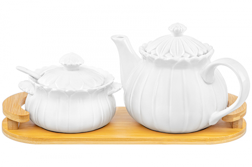 БЫЛО 1451 руб! Набор - чайник 700 мл + сахарница 300 мл "Цветок" с ложкой на дер. подставке с ручками