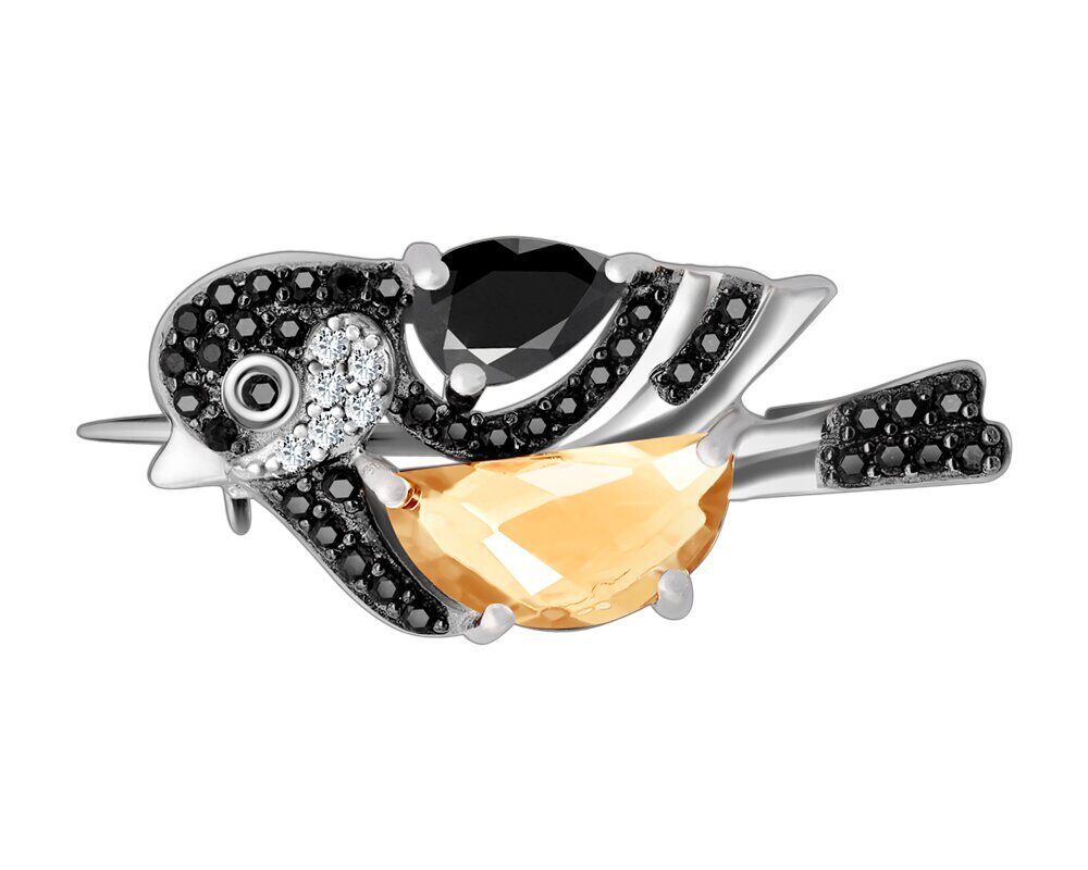Брошь, цитрин , сапфир корунд , шпинель, Снегирь