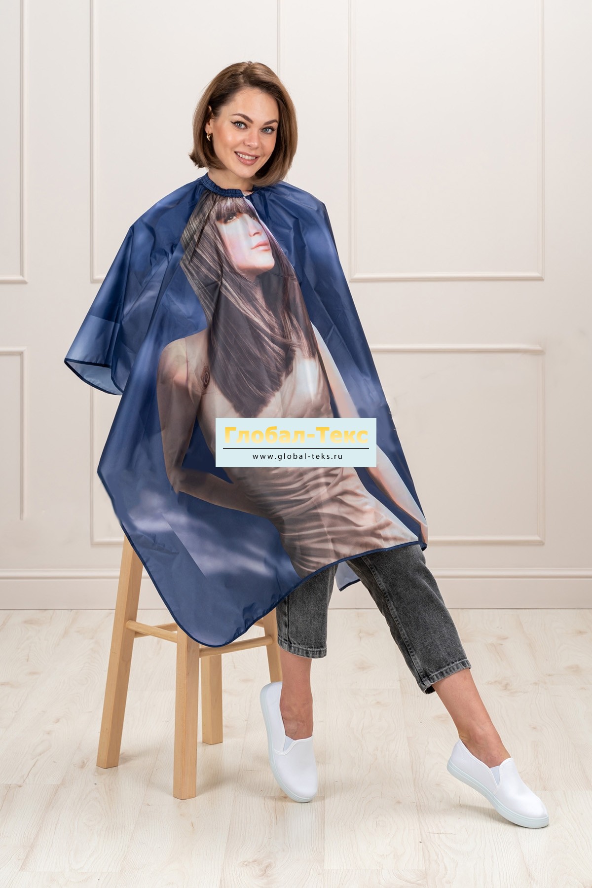 Пеньюар для парикмахера "Модерн" (темно-синий/девушка, 1,4х1,5 м.) №УФР-ТР-520-1