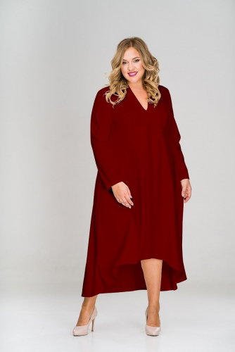 Платье креп с асимметричным низом и воротником стойка, бордовое